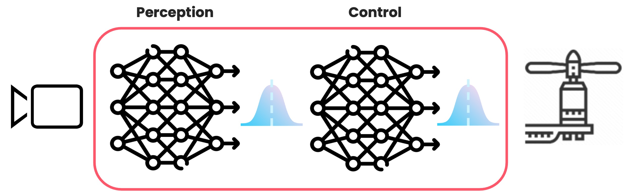 We consider a minimalistic end-to-end deep learning-based navigation architecture to study uncertainty propagation and its use. Therefore, in our experiments, the autonomus navigation architecture consists of two neural network components, one for perception and the other for control, as presented in Figure 2.
