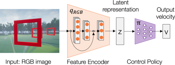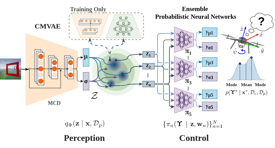 Once the perception component is trained, we use only the encoder of the trained CM-VAE to get a rich compact representation (latent vector) of the input image. The downstream control task (control policy $\pi$) uses a MLP network to operate on the latent vectors $z$ at the output of the CMVAE encoder $q_{\phi}$ to predict UAV velocities. To this end, a probabilistic control policy network is added at the output of the perception encoder $q_{\phi}$, forming the UAV navigation stack. The probabilistic control policy network $\pi_{w}(\Upsilon \mid \mathbf{z})$ predicts the mean and the variance for each velocity command given a perception representation $z$ from the encoder $q_{\phi}$, i.e., \(\Upsilon \sim \mathcal{N}\big(\mu_{w}(z), \sigma^{2}_{w}(z)\big)\), where \(\Upsilon_{\mu} = \{\mu_{\dot{x}}, \mu_{\dot{y}}, \mu_{\dot{z}}, \mu_{\dot{\psi}}\}\) and \(\Upsilon_{\sigma^{2}} = \{\sigma^{2}_{\dot{x}}, \sigma^{2}_{\dot{y}}, \sigma^{2}_{\dot{z}}, \sigma^{2}_{\dot{\psi}}\}\). For training the probabilistic control policy, we use imitation learning with a dedicated control dataset $\mathcal{D}_c$, and the heteroscedastic loss function