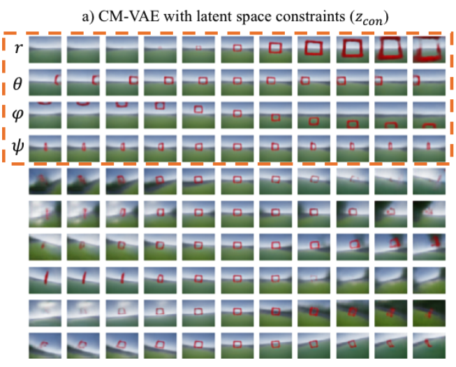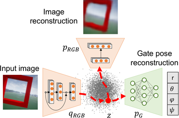 Moreover, the additional network block for predicting the gate poste, is connected in an usual way to the VAE. The regression block only uses the first four variables of the latent vector at the output of the CM-VAE encode. In addition, each of this 4 latent vector variables, is connected to a dedicated regressor for each of the predicted spherical coordinates (radius, polar, azimuth, yaw). This causes a stronger regularization to the latent space during traning since the first 4 variables of the latent space vector will receive an additional flow of error gradients corersponding to pose prediction errors, and therefore, forcing the disentanglement of this 4 latent vector variables, as presented in Figure 5.